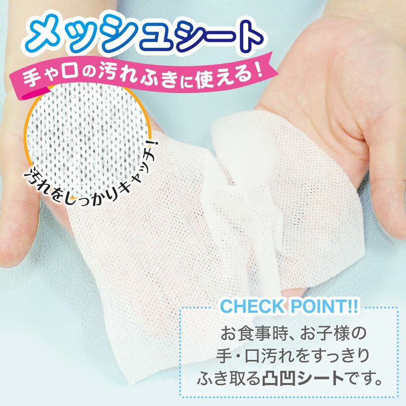 ●成分の99%以上が純水でできた安心手くちふきです。 ●生産開始からパッケージまで、人の手が一切触れずに製造。徹底的に衛生管理された日本国内の自社工場でつくられています。 ●うるおい保湿成分緑茶エキス配合。 ●汚れをしっかりキャッチするメッシュタイプのシートです。 ●便利なオーバーストップ機能がついたフラップシールなので、片手でシートが取り出しやすいです。