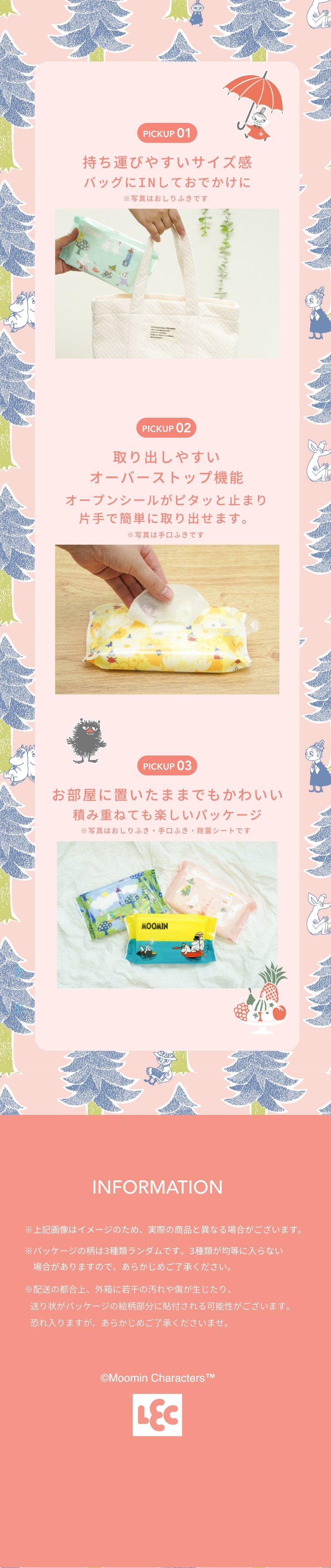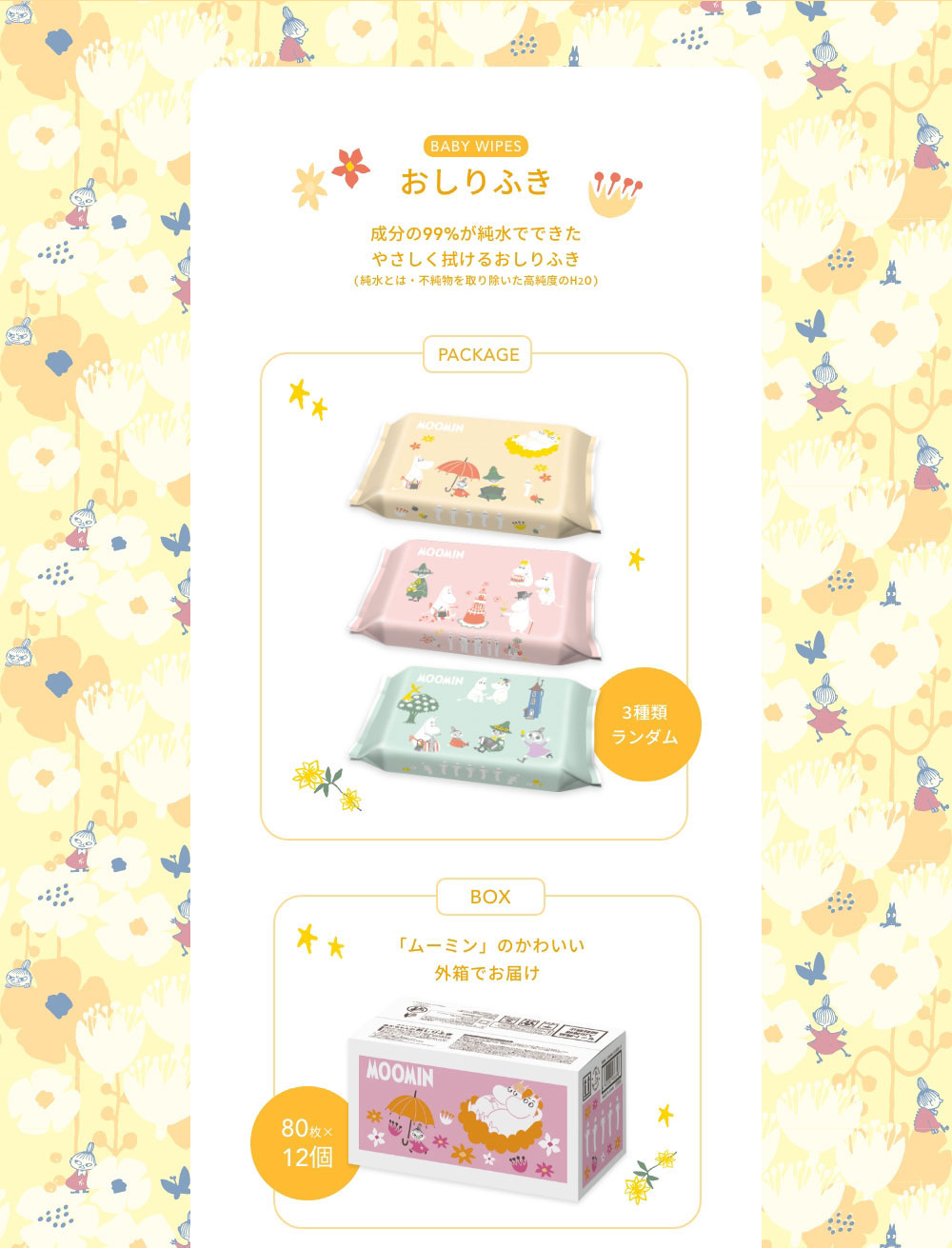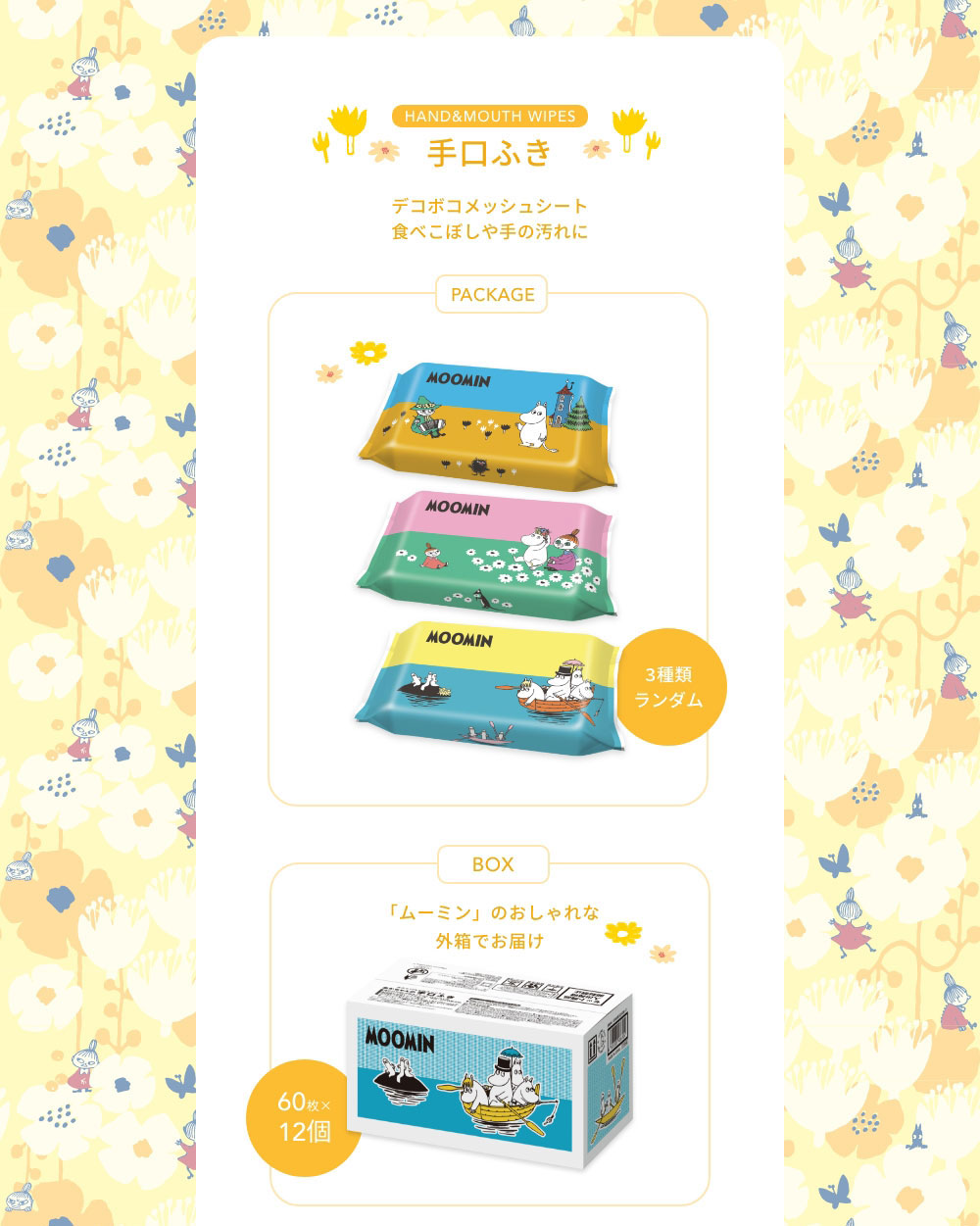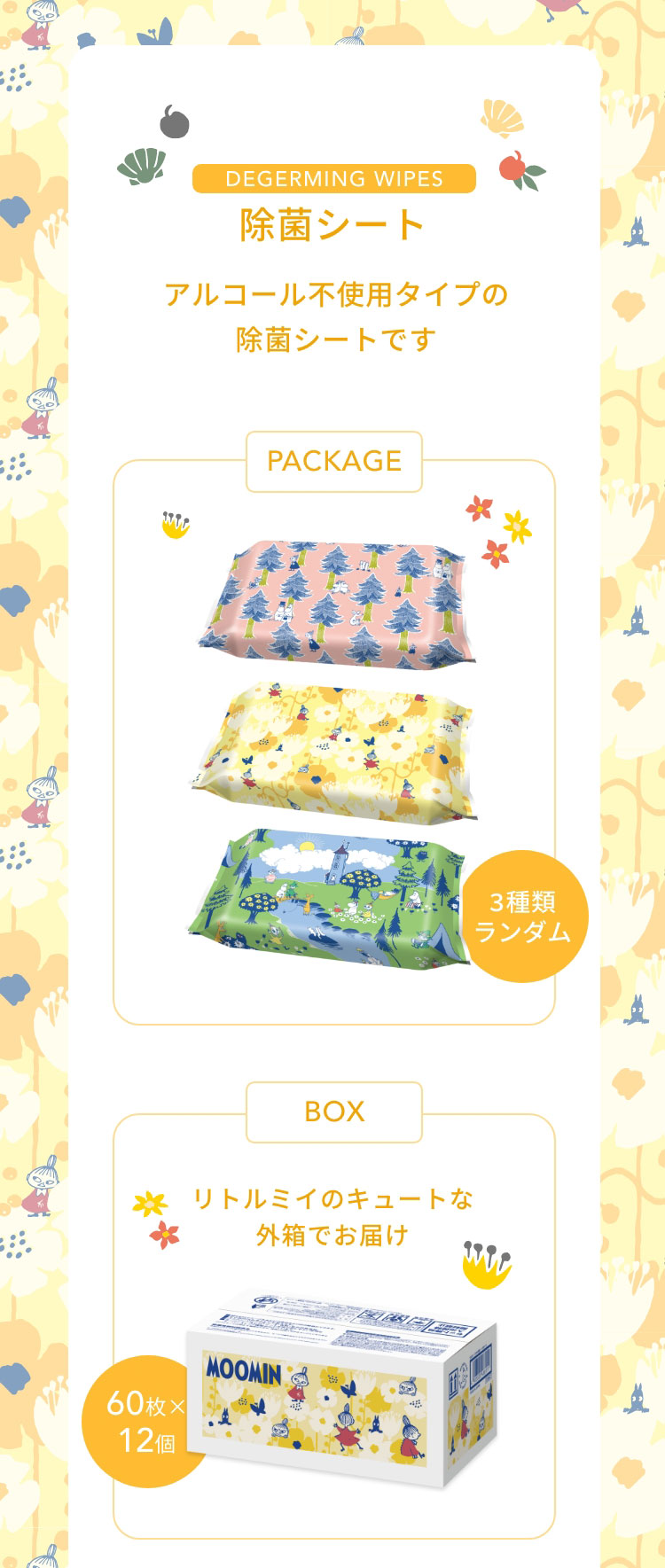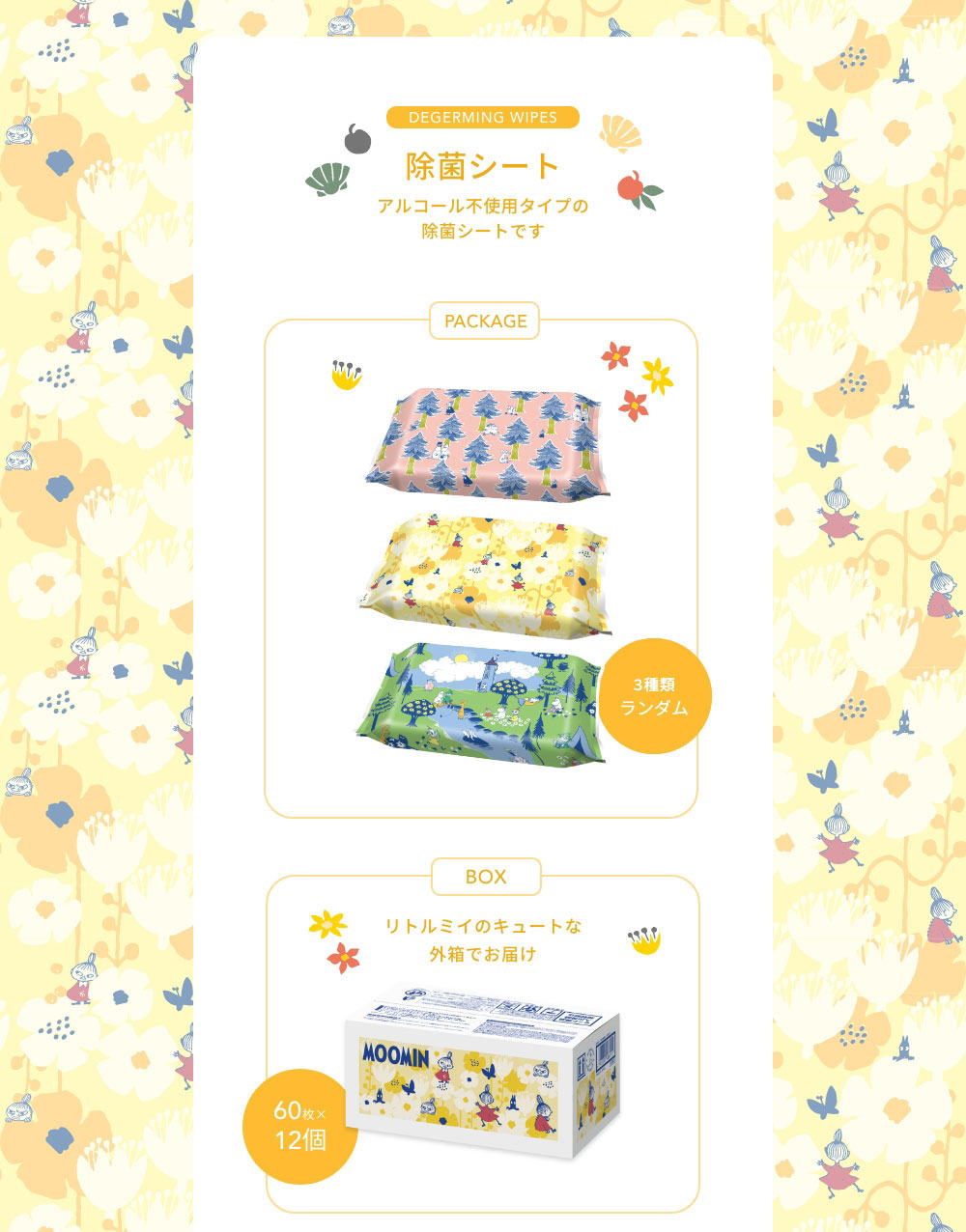 ●ノンアルコールタイプの除菌ウエットシートです。●拭くだけでテーブルまわりや、身のまわり品の除菌ができます。●手や指の汚れ落としにも使えます。●パラベン、PG、アルコール、香料、着色料 無添加です。●除菌性能試験済み(本品はふきとった後の菌を減少させるもので、すべての菌を除去するものではありません。●ムーミンのかわいい外箱でお届けします。●webでしか手に入らない、限定アイテムです。 ※配送の都合上、外箱に若干の汚れや傷が生じたり、送り状がパッケージの絵柄部分に貼付される可能性がございます。 恐れ入りますが、あらかじめご了承くださいませ。