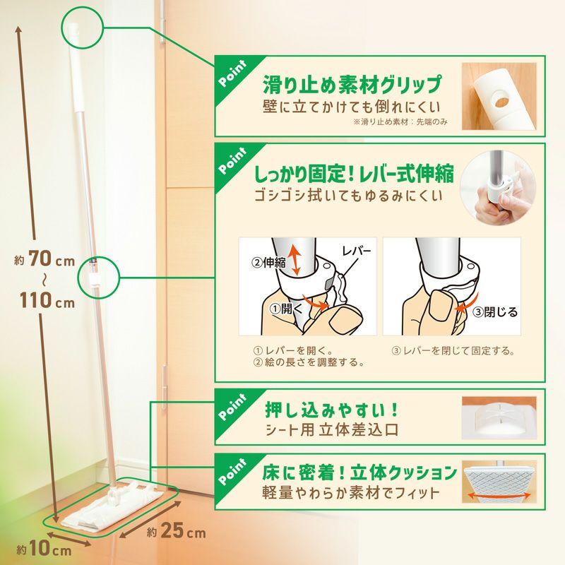 アルカリ電解水配合のフローリングシートや、ホコリ・ダニを取る粘着カーペットクリーナー等をおすすめします。