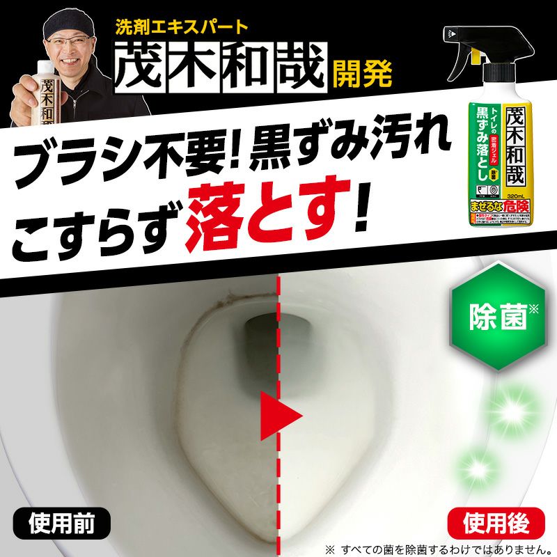 ●塩素系密着ジェルを噴射し水で洗い流すだけで、トイレの黒ずみをきれいにすることができます。