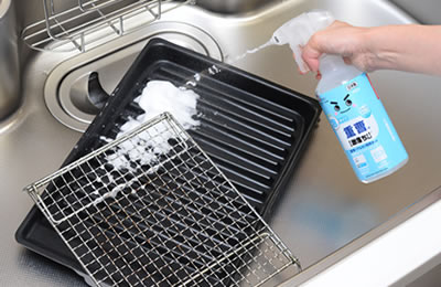 ●水を独自の方法で電気分解したアルカリ電解水に、重曹を配合した無色無臭のクリーナーです。