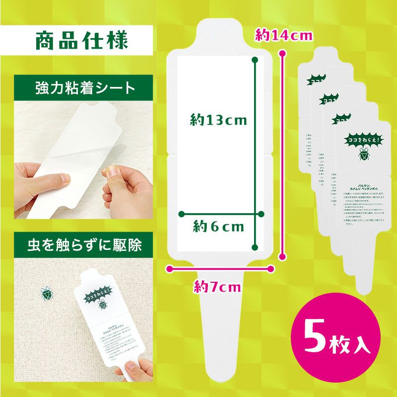 ●カメムシを触らずに駆除できます。●強力な粘着面が捕まえたカメムシを逃がしません。●殺虫成分不使用なのでペットや小さいお子様がいるご家庭でも安心です。●紙製なので燃えるゴミで捨てるだけで大丈夫です。●使用場所:壁、床、洗濯物など
