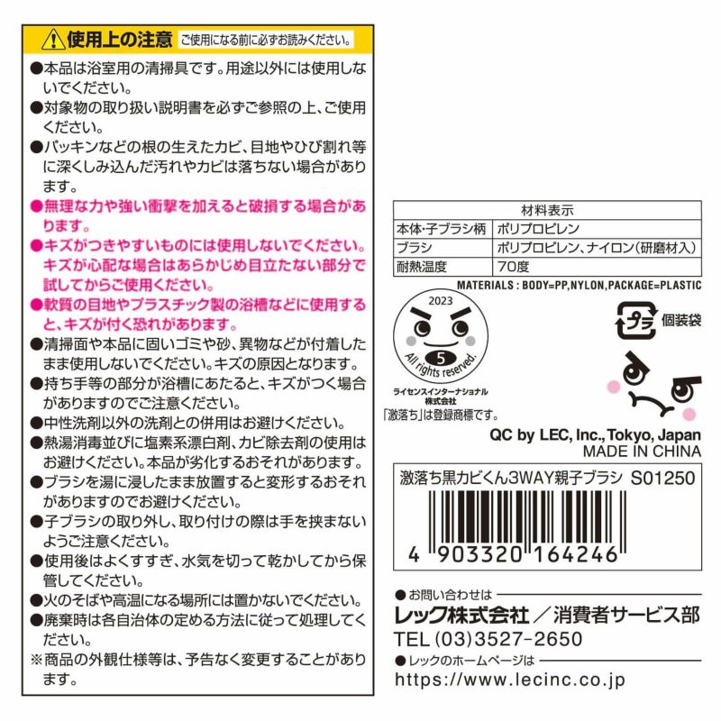●3種類のブラシで浴室の床や壁面、水道まわりや排水口まわりのカビ等のお掃除に便利です。