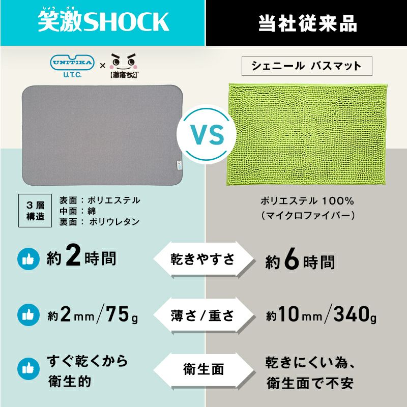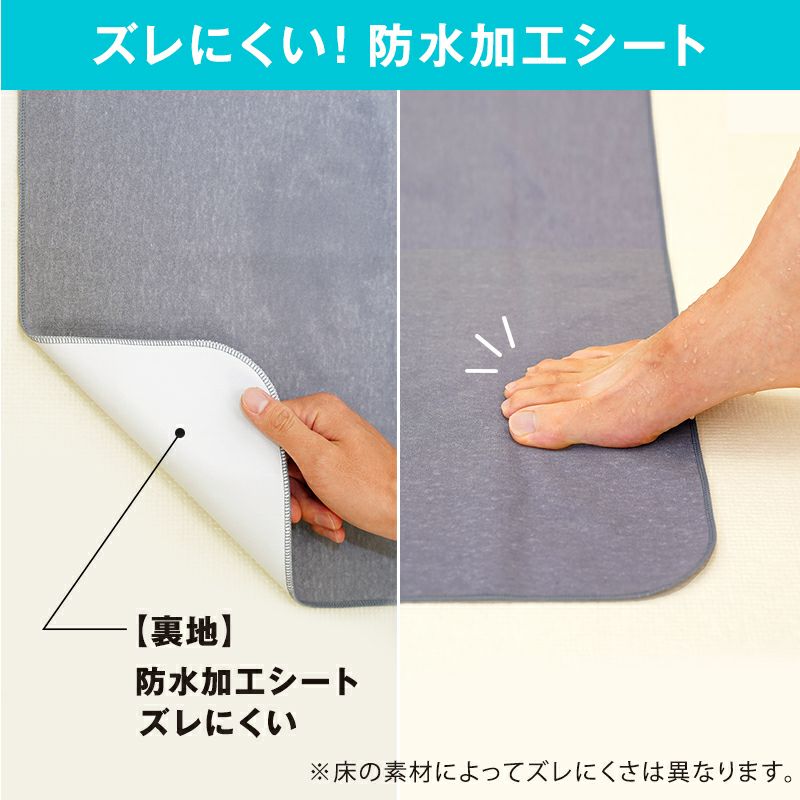 ●厚さ約2mmの超薄型のバスマットです。 ●1秒吸収!2~3人が続けて使用できる吸水力です。 ●ポリエステル、綿、ポリウレタンの特殊な3層構造で水分を吸水します。 ●洗濯時、収納時にかさばらず、速乾性に優れています。 ●サイズ45×60cm 厚み2mm