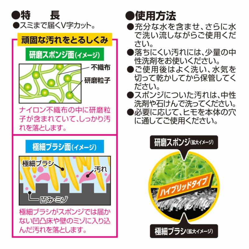 ●研磨スポンジ&極細ブラシの両面を使い分けることで汚れとカビを落とします。 ●V字カットの先端が壁の隅まで届きます。 ●立たせた時に水切れが良くなるアーチ型形状。 ●収納に便利な吊り下げ紐付きです。