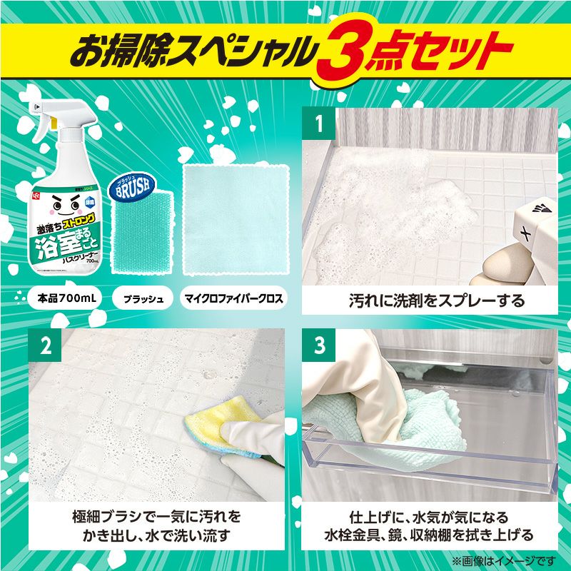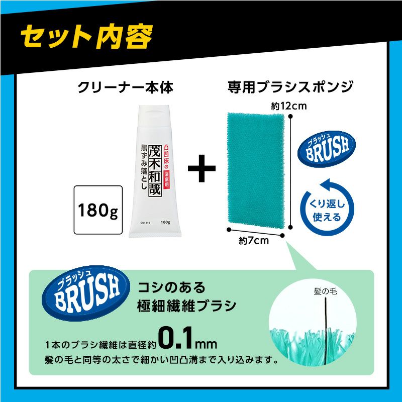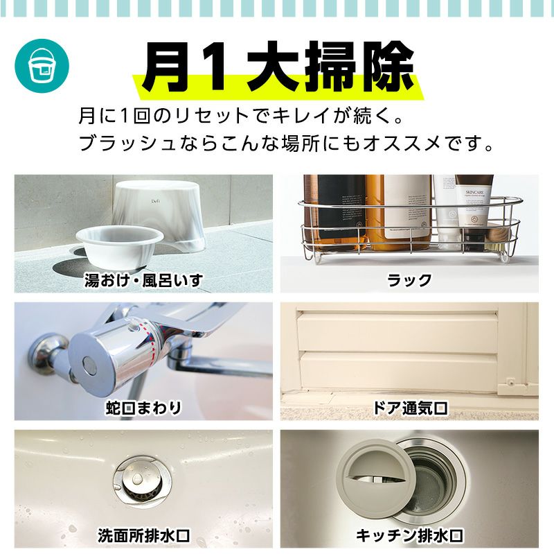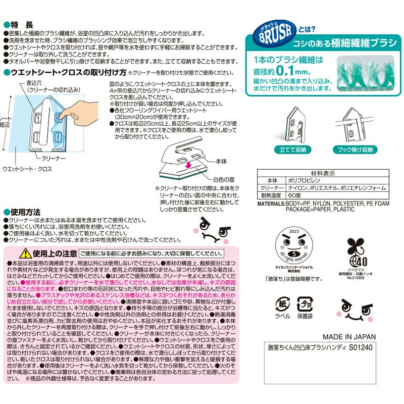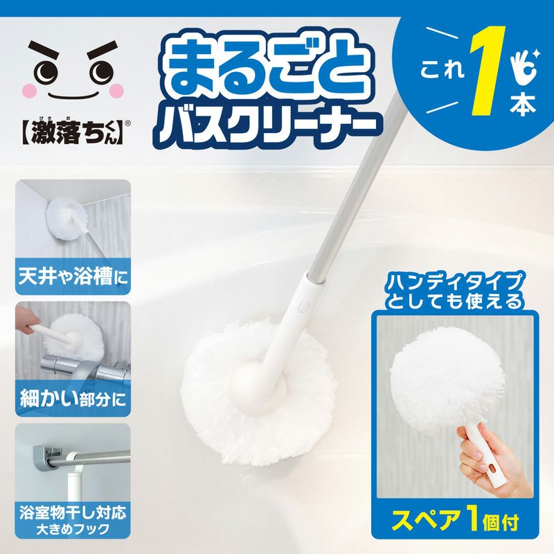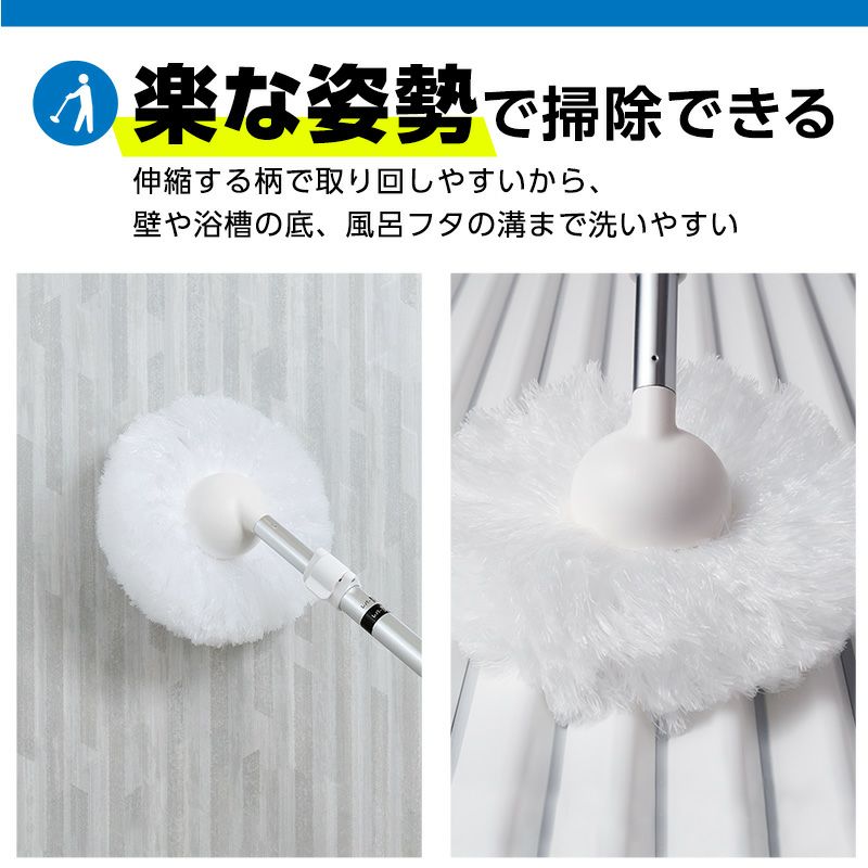 - 凸凹床の溝に最適なブラシ「床用 ハンディブラシ」や、立ったままお掃除できる伸縮タイプの「激落ち しぼれる のび~る お風呂用メラミン」、皮脂汚れやぬめり取りに最適なスポンジ「激落ち バスクリーナー」など、他にもお客様のバスルーム環境のお悩みを解決するそうじ用品をご用意しております。
