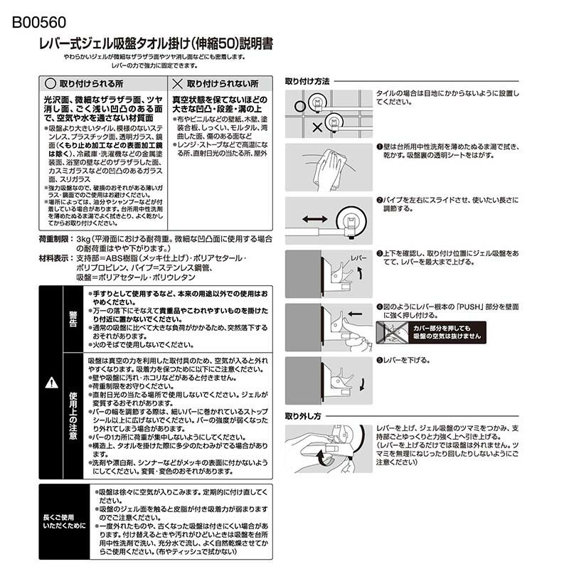 他の画像を見る 送料無料 やわらかいジェルが微細なザラザラ面やツヤ消し面などにも密着します。 レバー式ジェル吸盤タイプ タオル掛け 伸縮タイプ 最大干し幅47cm(全長34.5~55cm) 通常価格 ¥ 1,958 のところ ¥ 1,860 税込 お気に入りに登録する