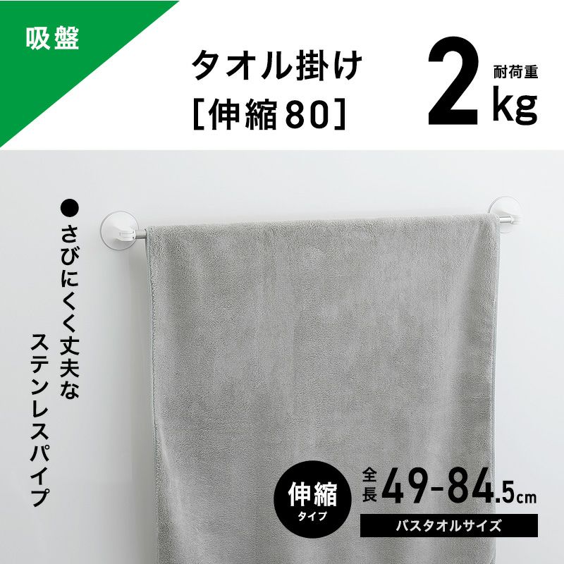 吸盤がしっかりつかない場合も、付属の補助板で設置可能です。 吸盤タイプ タオル掛け 伸縮タイプ 最大干し幅76.5cm(全長49~84.5cm) 吸盤補助板付