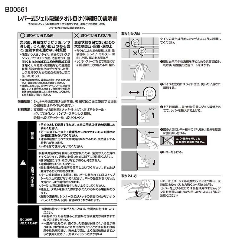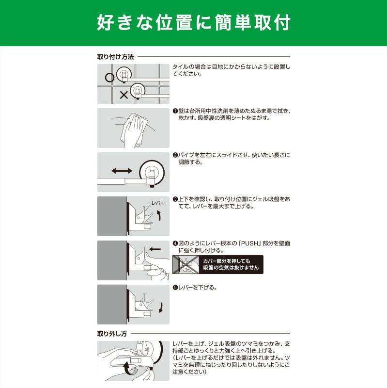 ※場所によっては、油分やシャンプーなどが付着している場合があります。台所用洗剤を薄めたぬるま湯でよく洗い、よく乾かしてからお取り付けください。
