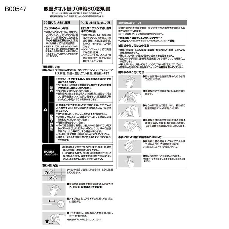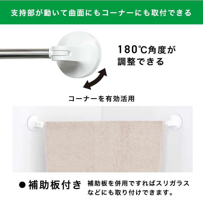 吸盤がしっかりつかない場合も、付属の補助板で設置可能です。 吸盤タイプ タオル掛け 伸縮タイプ 最大干し幅76.5cm(全長49~84.5cm) 吸盤補助板付