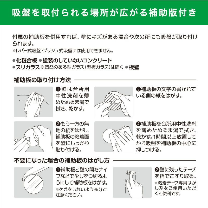 付属の補助板を併用すれば、壁にキズがある場合や次の所にも吸盤が取り付けられます。