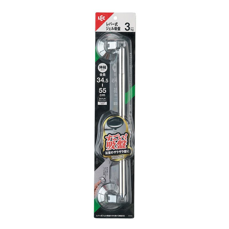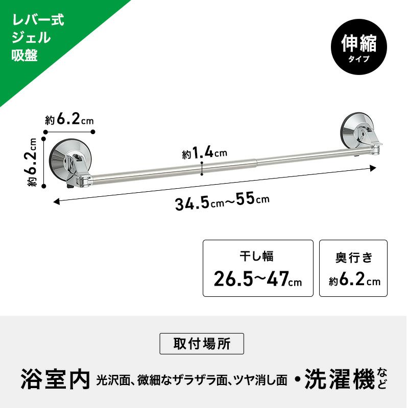 やわらかいジェルが微細なザラザラ面やツヤ消し面などにも密着します。 レバー式ジェル吸盤タイプ タオル掛け 伸縮タイプ 最大干し幅47cm(全長34.5~55cm)