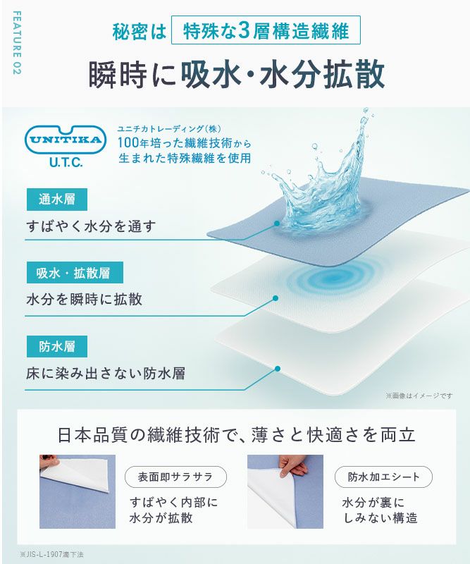 ユニチカグループの「100年培った繊維技術」により生まれた 3層構造の特殊繊維を採用したバスマットです。