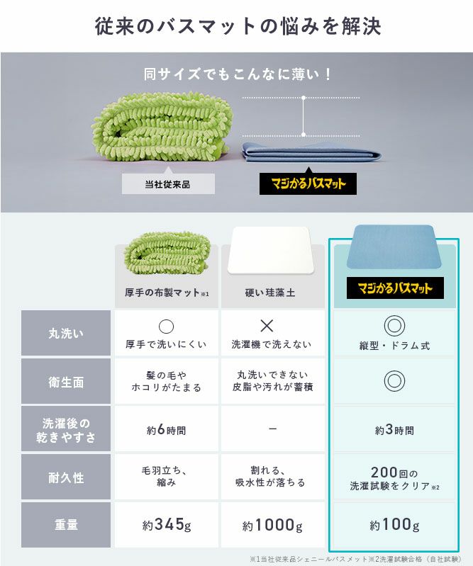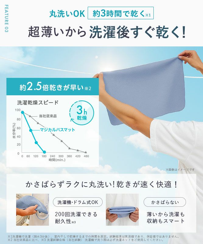 薄いので気軽に洗濯でき衛生的。200回洗濯できる耐久性※ ※洗濯試験合格(自社試験)