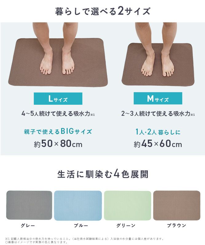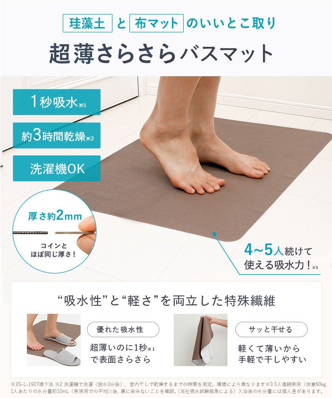踏んだ瞬間にすぐ吸水!足裏もバスマットもすぐにさらさら。※1 JIS-L-1907滴下法