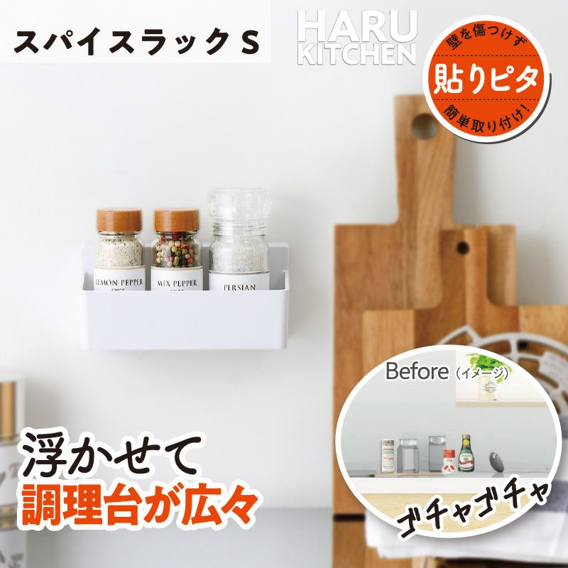 ●傷をつけず、キッチンの壁にピタッとキレイに貼れるスパイスラックです。
