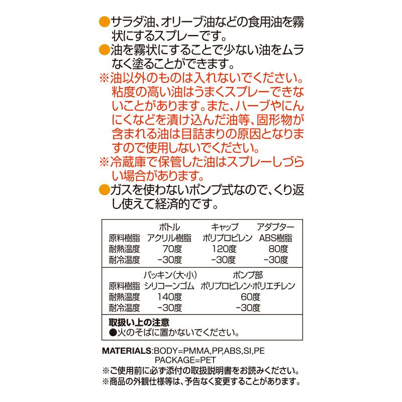 ●サラダ油、オリーブ油などの食用油を霧状にするスプレーです。