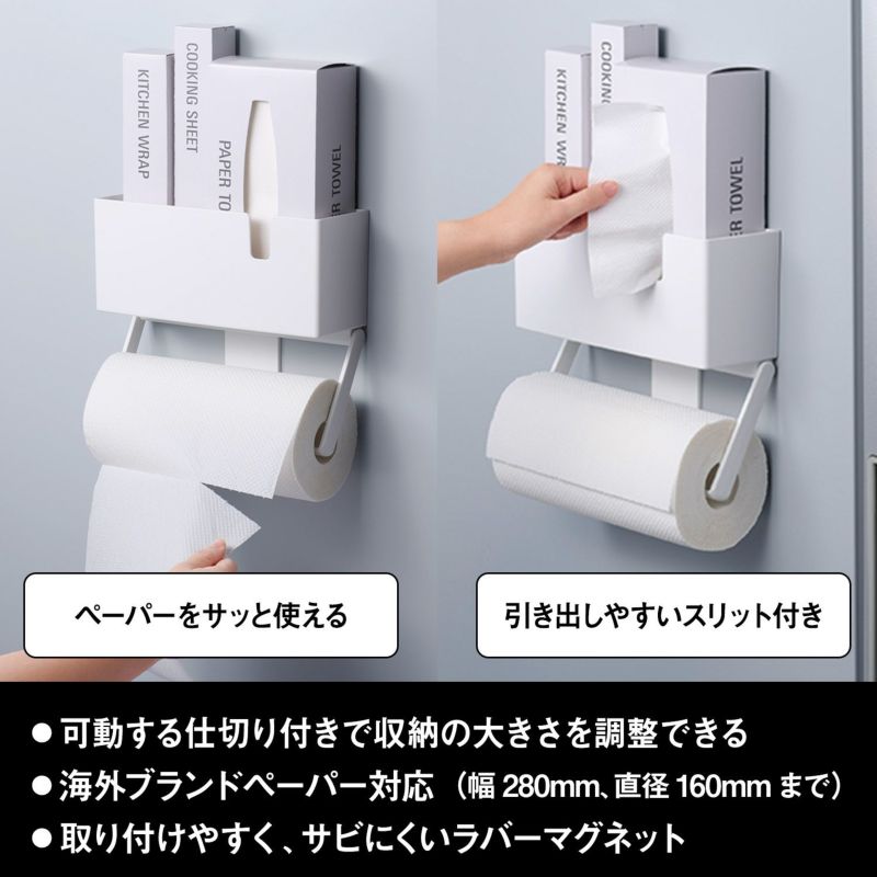 ●ラップやペーパーをまとめて収納できます。 ●引き出しやすいスリット付きです。 ●海外製ロールペーパー対応です。 ●サビにくいラバーマグネット付きです。