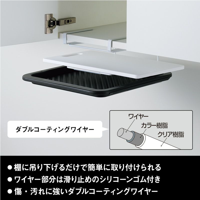 ●オーブン皿やトレーをまとめて収納できます。 ●キズ、汚れに強いダブルコーティングワイヤーです。 ●まな板も収納できます。 ●耐荷重2㎏ 1段につき1㎏