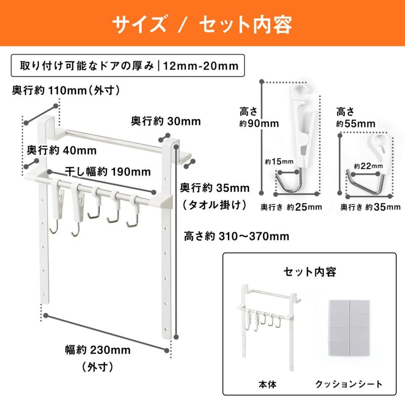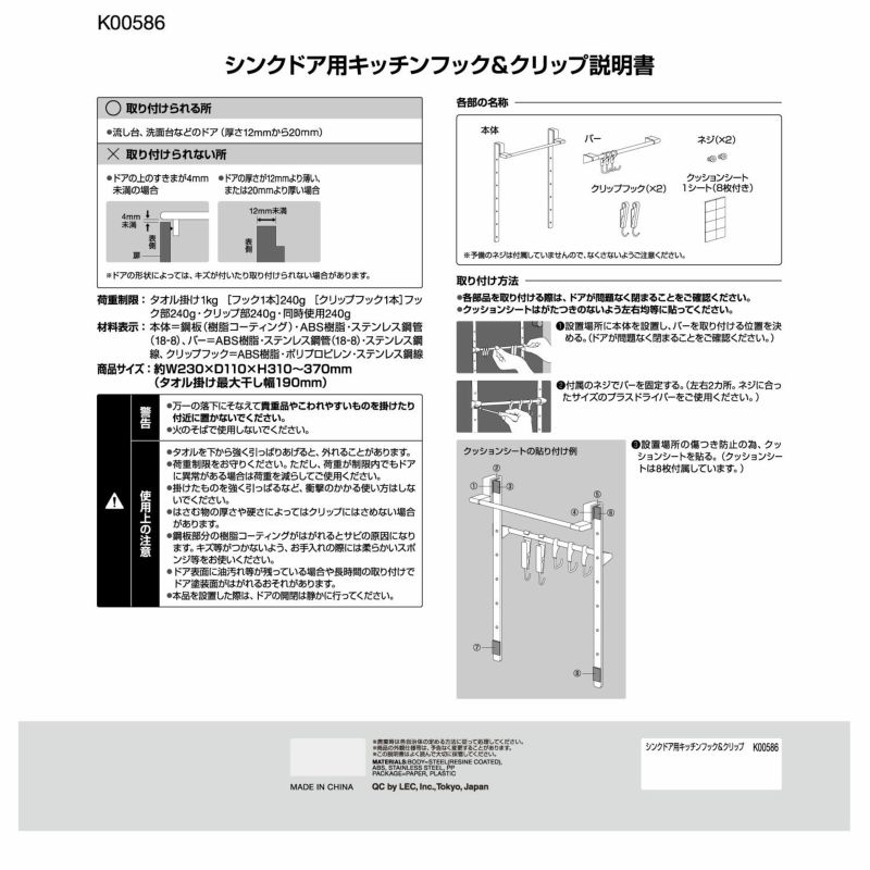 ●シンクドアの内側にツールや手袋を収納できます。 ●はさめるクリップフック付きです。 ●フック3本、クリップフック2本が付いています。 ●バーの位置を調整できます。 ●耐荷重 タオル掛け1㎏ フック、クリップ1本につき240g