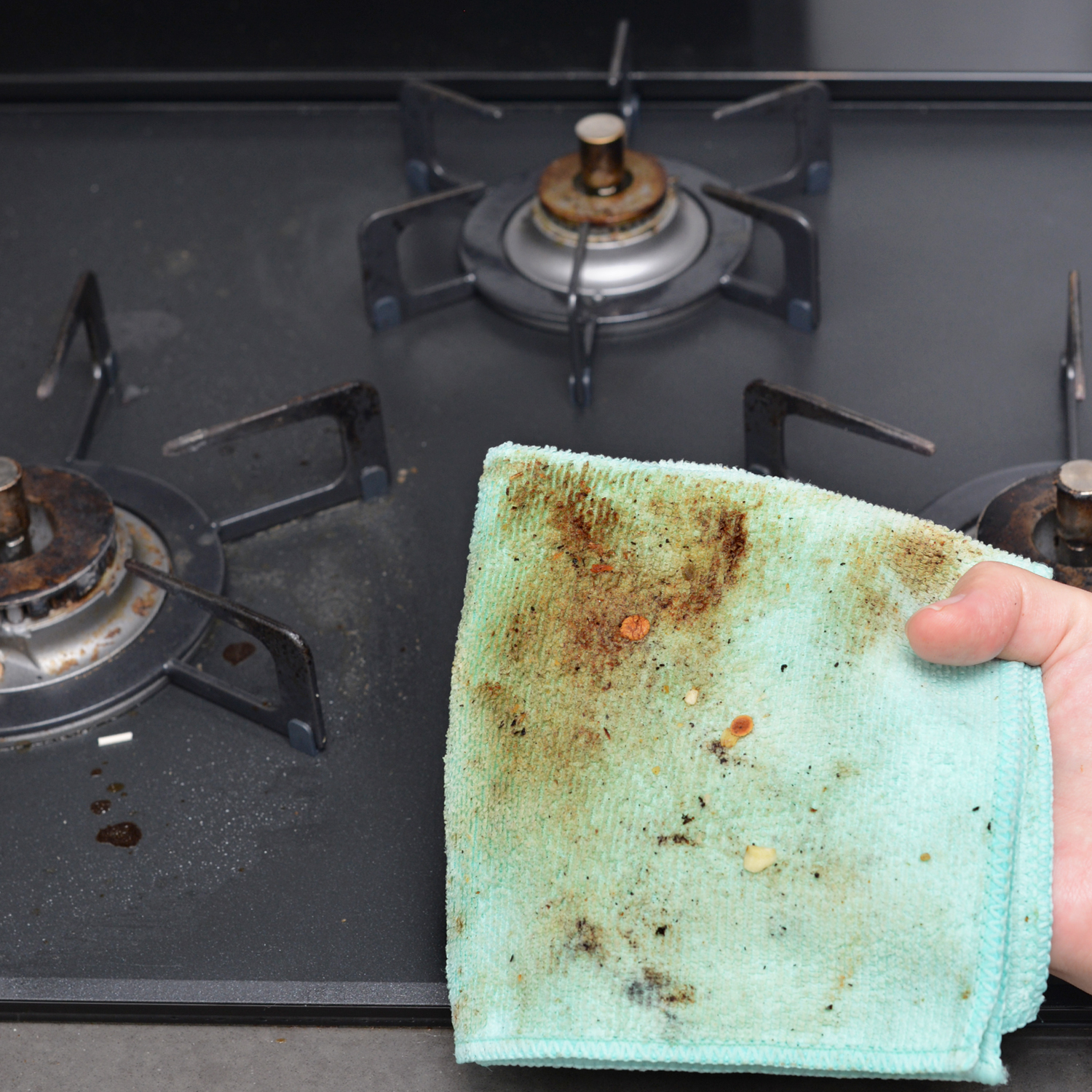 固く絞った水拭きなら、油汚れも洗剤なしでスッキリ。マイクロファイバーの多角形の鋭いエッジが、汚れをしっかりこすり落とします。