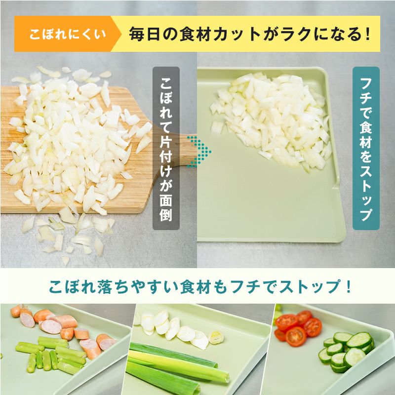 ●フチがついているので切った食材がこぼれにくく、後片付けがラクになります。