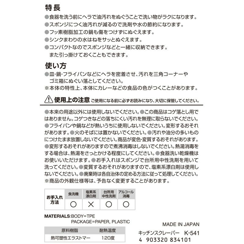●お皿や鍋のベタベタ汚れをサッとぬぐう、弾力性のあるヘラです。