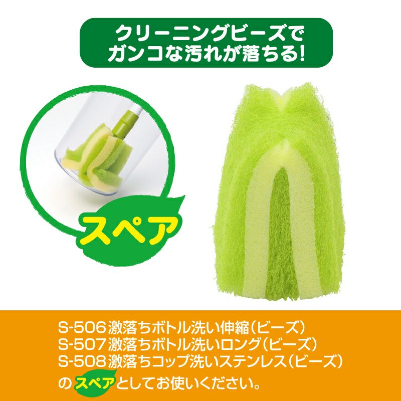 ※本品はスペアです。「激落ちボトル洗い伸縮(ビーズ)」の取り換え用スポンジとしてお買い求めください。 ●柔らかいプラスチック製クリーニングビーズ入りでキズが付きにくく、水だけで汚れを落とせます。 ●スポンジが開いてスミまで届きます。