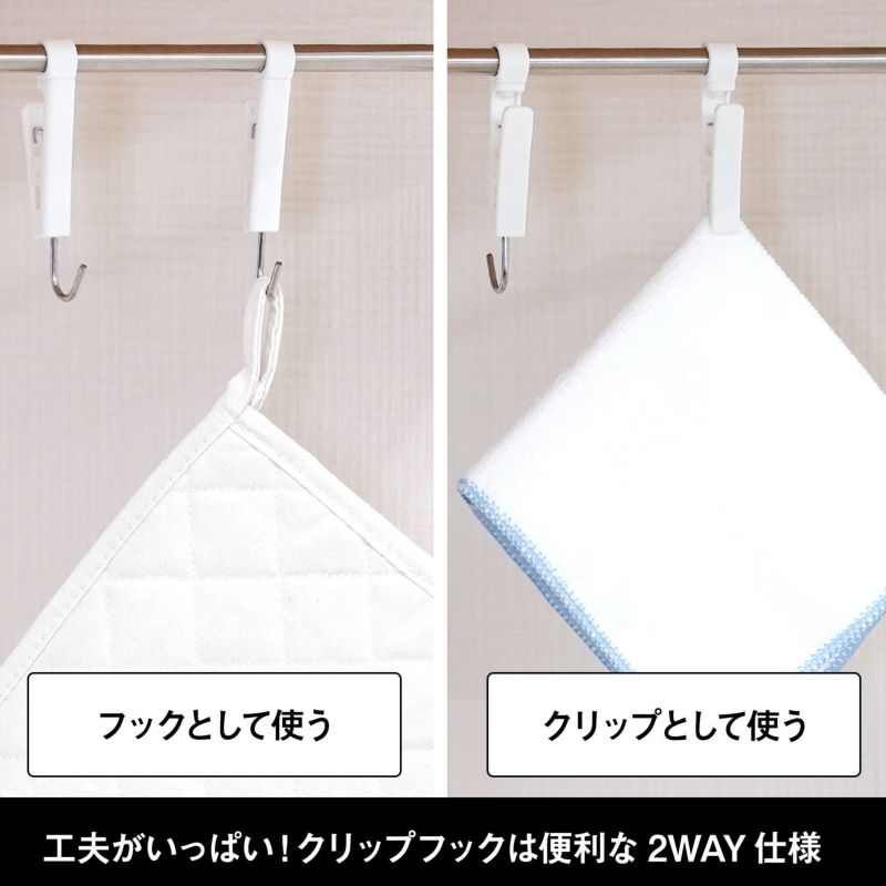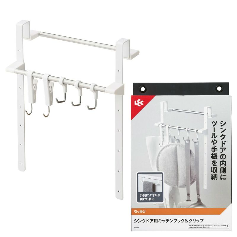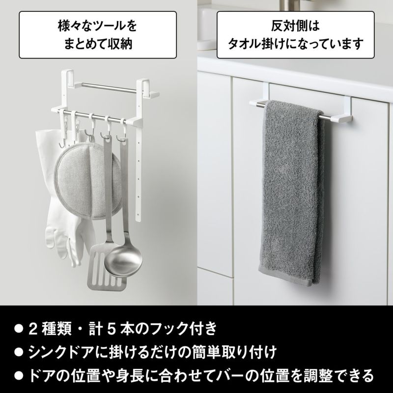 ●シンクドアの内側にツールや手袋を収納できます。 ●はさめるクリップフック付きです。 ●フック3本、クリップフック2本が付いています。 ●バーの位置を調整できます。 ●耐荷重 タオル掛け1㎏ フック、クリップ1本につき240g
