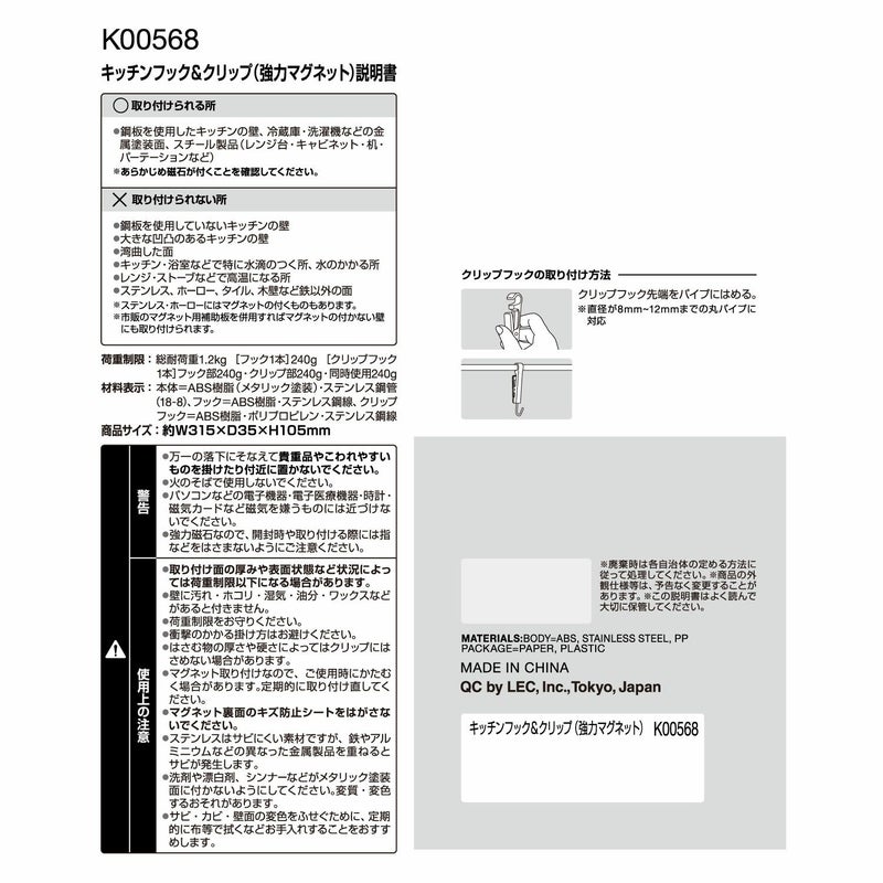 ●耐荷重1.2�L フック、クリップフック1本につき240g