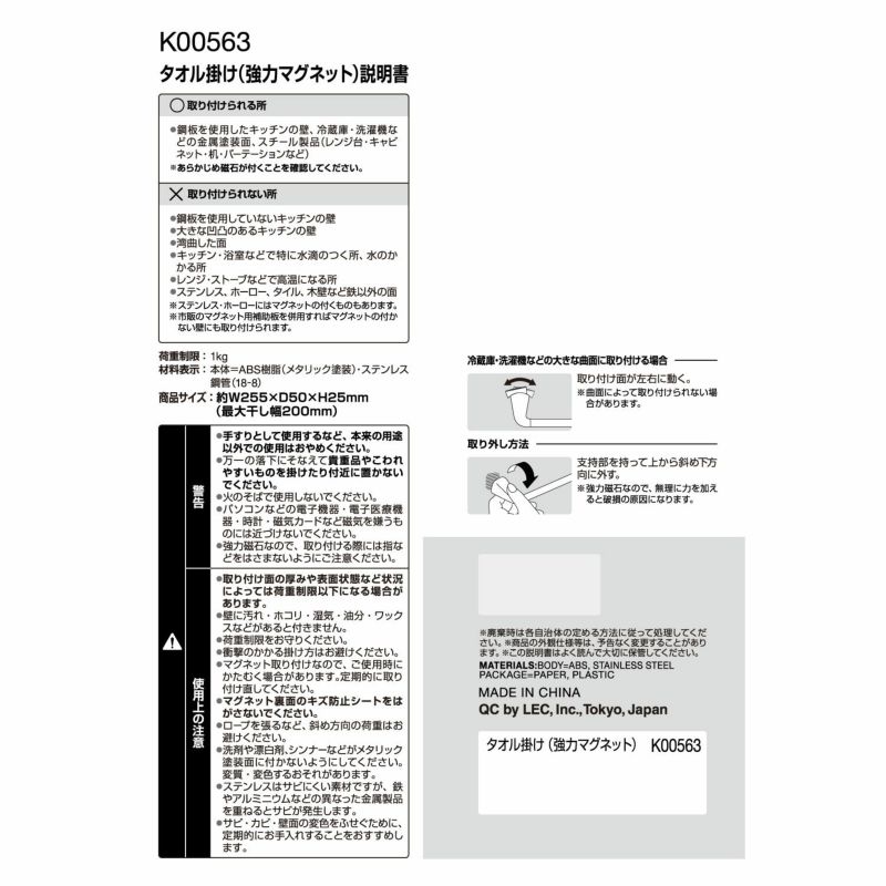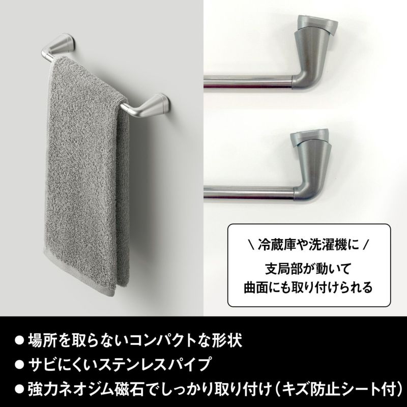 ●場所を取らないコンパクトな形状です。 ●強力ネオジム磁石でしっかり取り付けられます。(キズ防止シート付き) ●支持部が動いて曲面にも取り付けられます。 ●サビにくいステンレスパイプです。 ●耐荷重1㎏