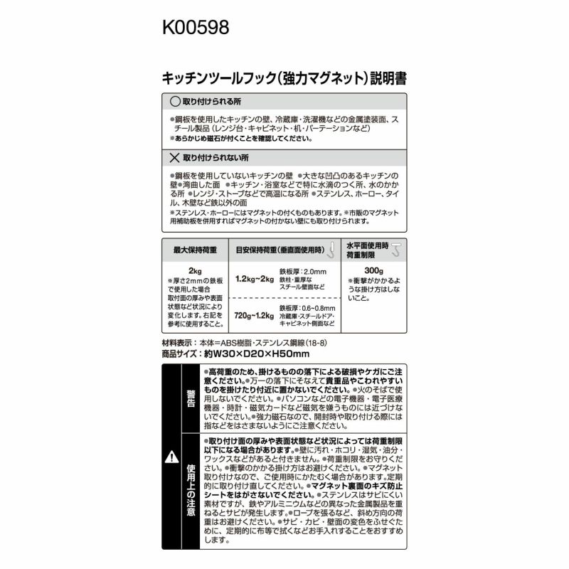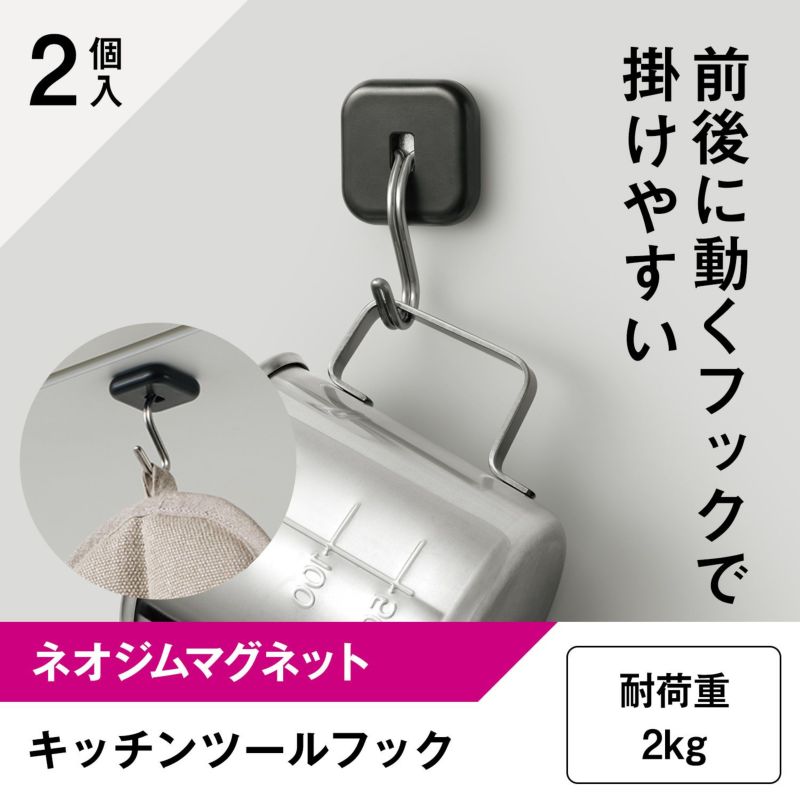 ●前後に可動するフックで掛けやすいです。 ●強力ネオジム磁石で吊り下げて取り付けできます。(キズ防止シート付き) ●サビにくいステンレスフックです。 ●最大保持荷重2㎏、2個入