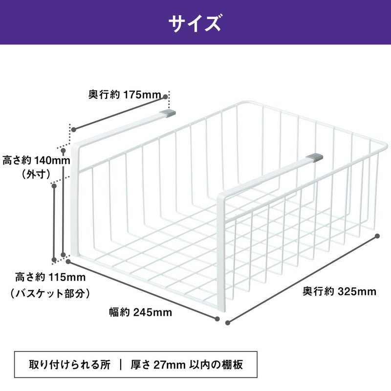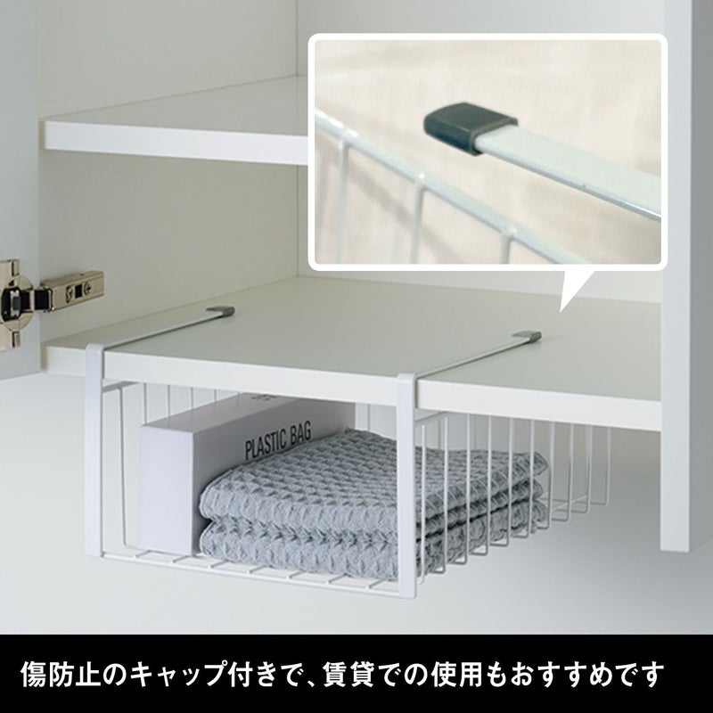 ●棚の底板に引掛けて、キッチン周りの小物を取り出しやすく収納できます。 ●ワイヤーはキズ・汚れに強いダブルコーティングです。 ●取り付けられる場所は、厚さ27�@までの棚板です。