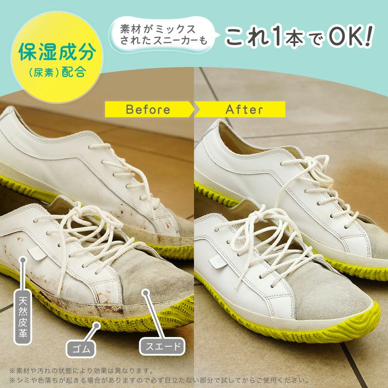 レザー・合皮・スエードにも使用できるから、素材がミックスされたスニーカーもこれ1本でOK。※シミや色落ちが起きないか、使用前にかならず目立たない部分で試してください。
