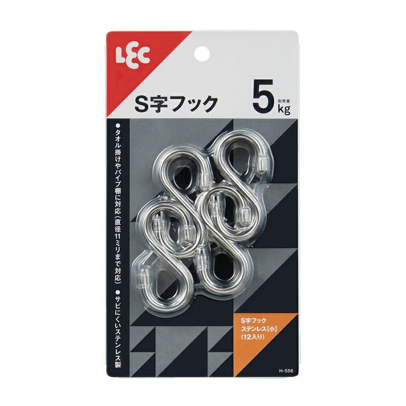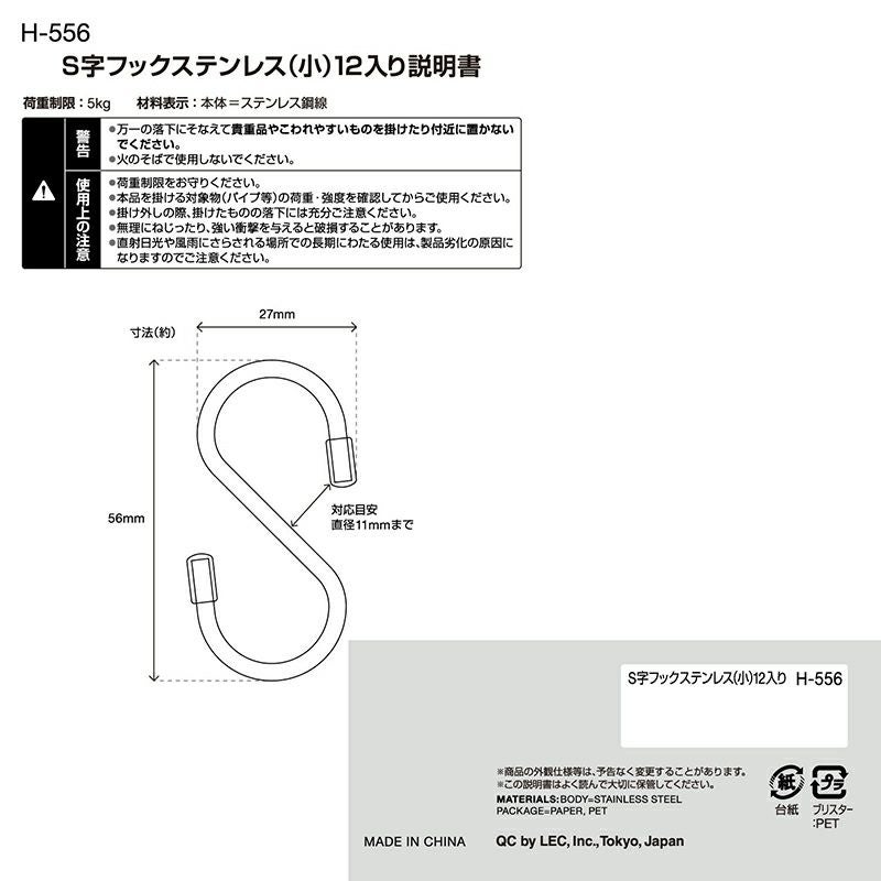 ●サビに強いステンレスを使用しています。 ●収納に便利、スタンダードなS字状のフックです。 ●直径約11mmまで対応で、タオル掛けやパイプ棚での使用に最適です。 ●先端部にキャップが付いていて安全です。