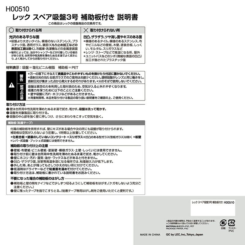 ●吸盤が付かない壁でも使える補助板付き 【主な取り付け場所】 タイル・プラスチック面・金属塗装面 (吸盤より大きいタイル、プラスチック面、金属塗装面、透明ガラスなど)
