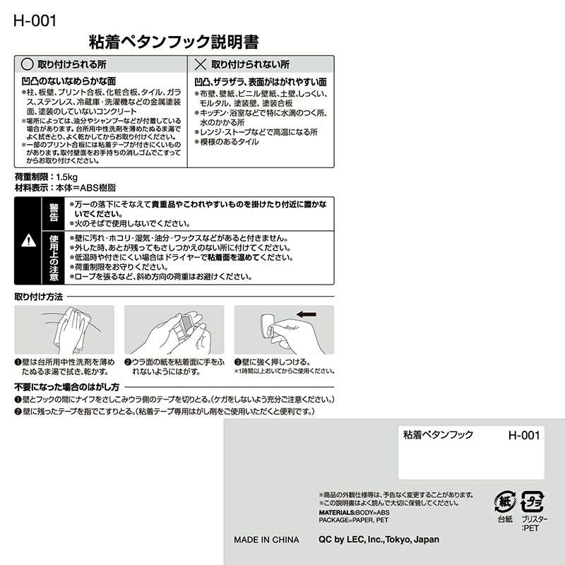 粘着テープで取り付け簡単 ペタンフック 耐荷重1.5kg 3個入 粘着テープタイプ