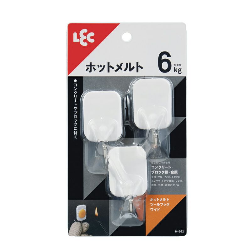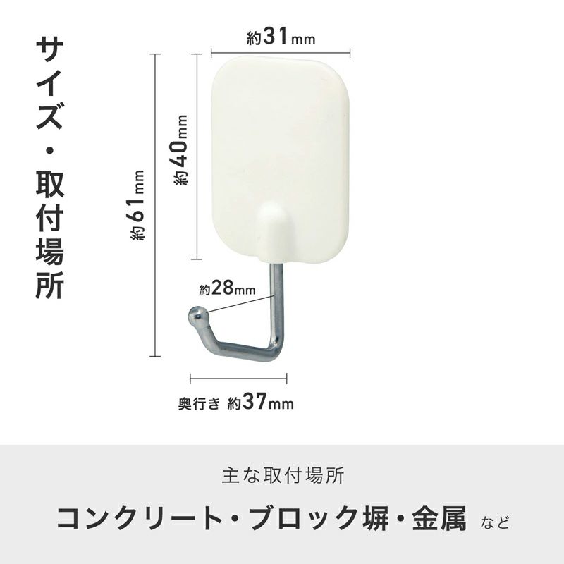 ●コンクリート、ブロック、外壁などに取り付けられるフックです。 ●ライターで接着剤を溶かして取り付けます。 【主な取り付け場所】 ブロック塀・ベランダなどのコンクリートや金属部、レンガ、木壁、外壁・浴室のタイル