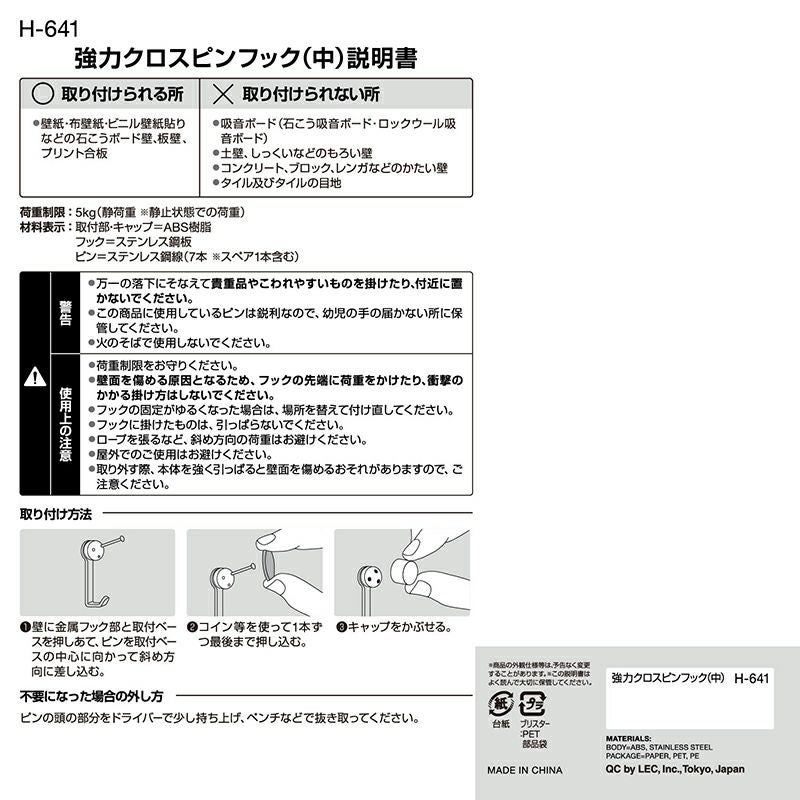 3本のロングピンが壁面内でクロスするのでしっかり固定できてグラつきません。 強力 クロス ピンフック (中) 耐荷重5kg 2個入
