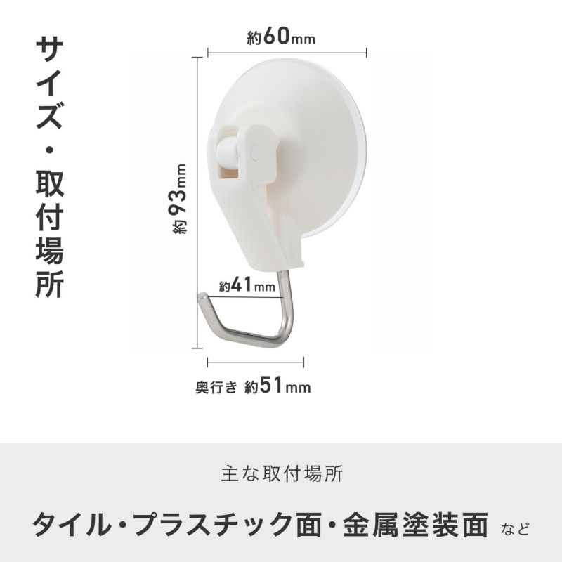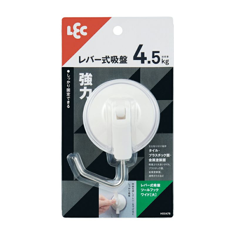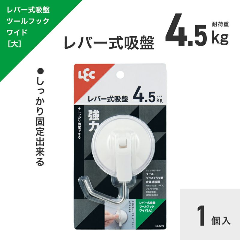 レバーを下げて空気を抜くことで強力に吸着します。 レバー式吸盤 ツールフックワイド サイズ大 耐荷重4.5kg 1個入 選べる2色