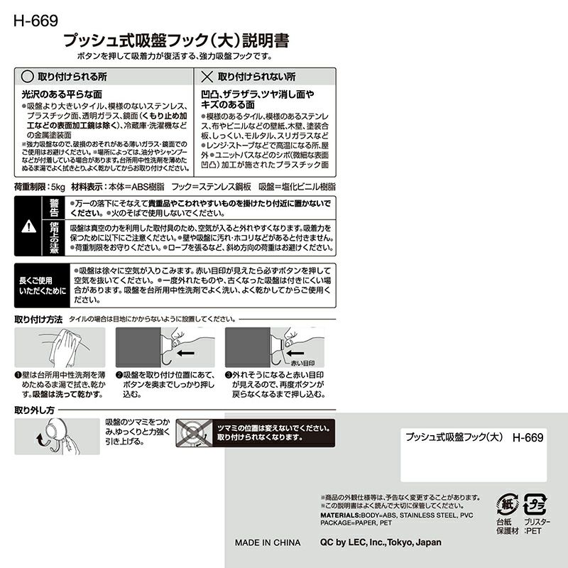 材質本体=ABS樹脂、フック=ステンレス鋼板、吸盤=塩化ビニル樹脂