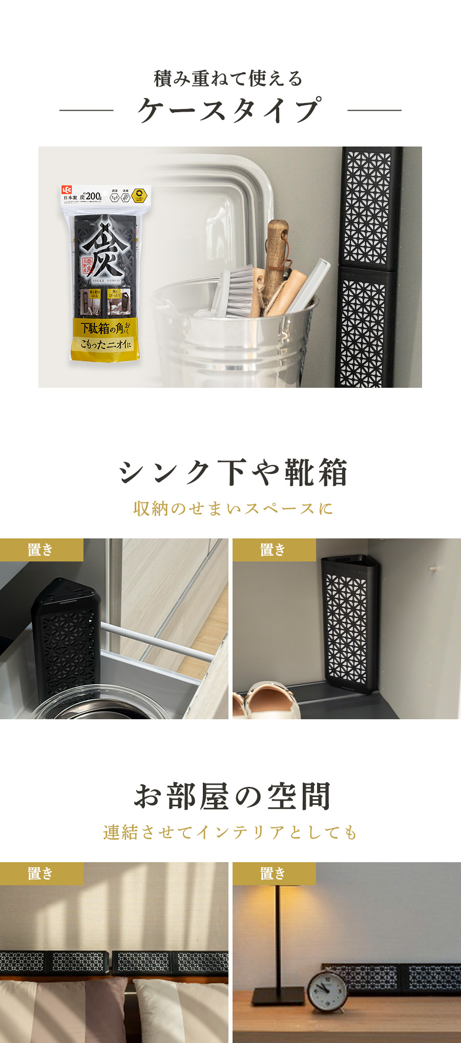 体臭、靴臭、タバコ臭、ペット臭、トイレの臭いなどに消臭効果を発揮します。炭のサイズによって効果範囲が異なりますので、パッケージに記載された対象場所を目安に使用してください。