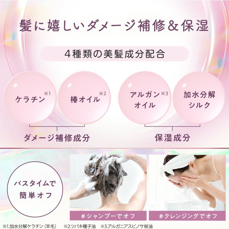 ※加水分解ケラチン(羊毛)・ツバキ種子油[ダメージ補修成分]、アルガニアスピノサ核油・加水分解シルク[保湿成分]