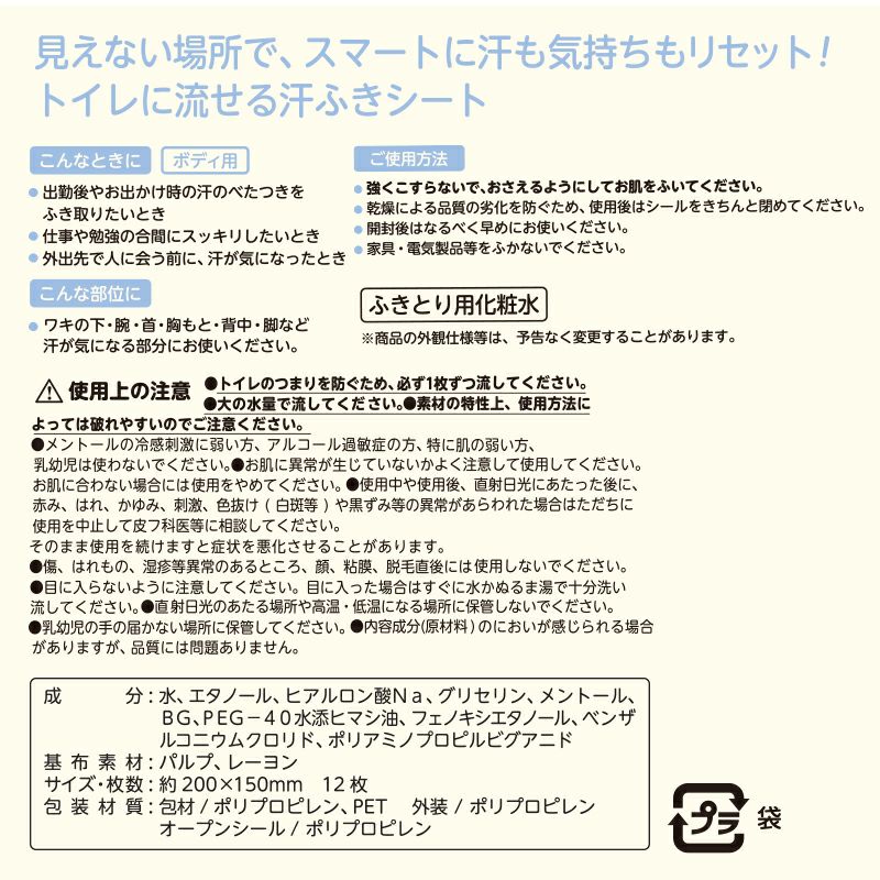 ●見えない場所で、スマートに汗も気持ちもリセット!トイレに流せるボディシートです。 ●水に流せる水解紙なので、トイレの個室で使用し、そのまま流すことができます。 ●デリケートゾーンシートでも使用している、肌にやさしいやわらかい素材を採用。 ●手のひらに持てる、丁度良い150×200mmサイズ。 ●ポーチやかばん、ポケットに入るスリムタイプ。 ●保湿成分のヒアルロン酸Na配合。 ●無香料 ●日本製