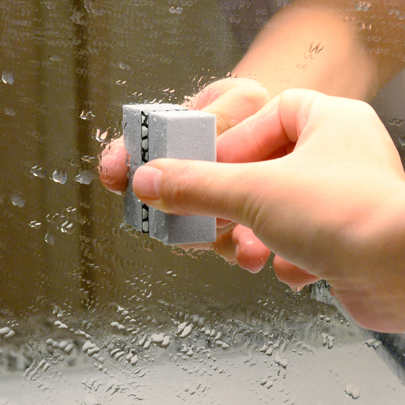 ●浴室鏡のガンコなウロコ汚れ(鱗状痕)を、水をつけてこするだけで簡単に落とします。