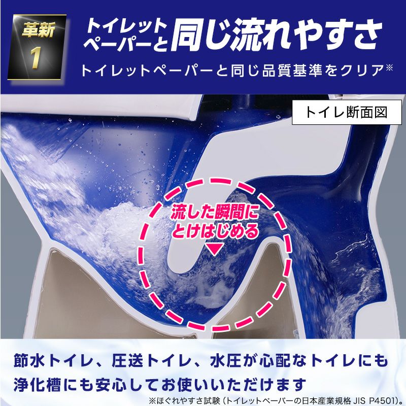 ●節水トイレ対応!ゴシゴシ拭けるのに水流で1秒でとける!特許製法のトイレクリーナーです。