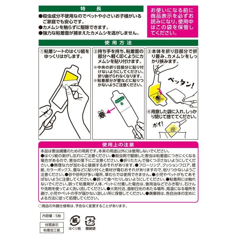●カメムシを触らずに駆除できます。●強力な粘着面が捕まえたカメムシを逃がしません。●殺虫成分不使用なのでペットや小さいお子様がいるご家庭でも安心です。●紙製なので燃えるゴミで捨てるだけで大丈夫です。●使用場所:壁、床、洗濯物など