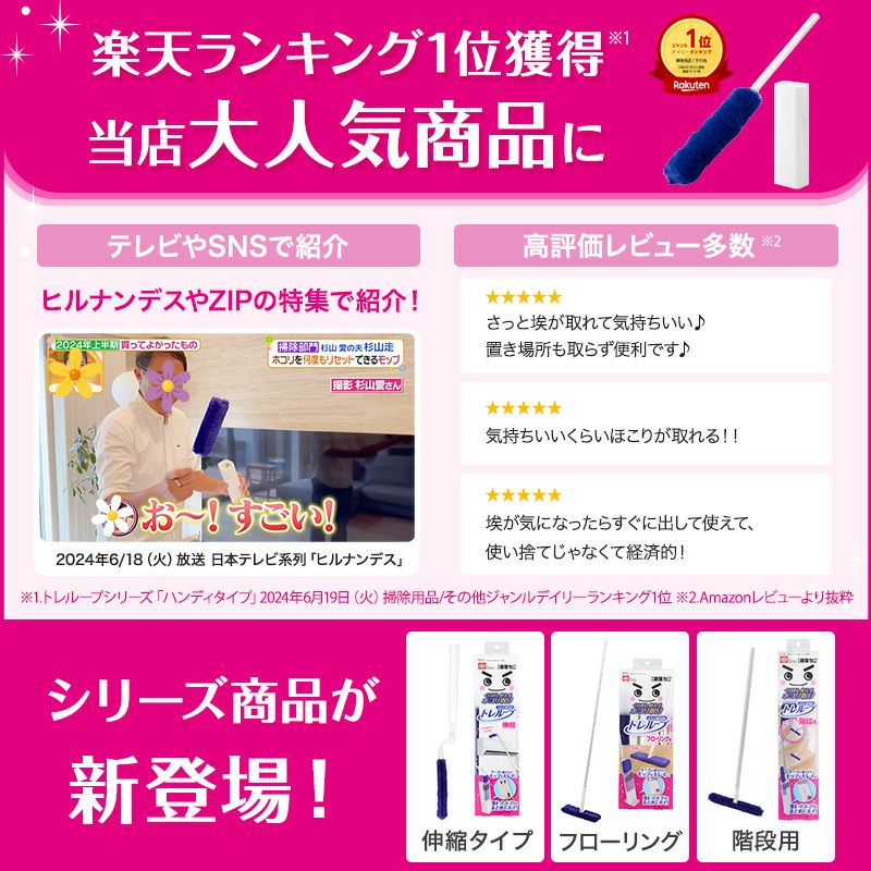 ●360度全面モップのため広い床面だけでなく、モップを立てて家具、家電などのスキマのお掃除にも便利です。 ●モップはケースに通すとキレイになり、ホコリは徐々に溜まってまとまります。 ●ケースがパカッと大きく開くので、溜まったホコリが簡単に捨てられます。 ●自立収納できるケース付きなので、リビング等で手に取りやすい場所に置きやすくいつでもサッとお掃除できます。 ●ケース根本を足で抑えてモップを抜き差しできます。