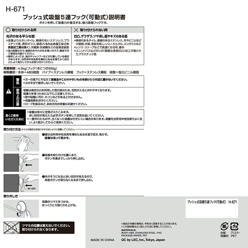 他の画像を見る 特価品 吸着力低下お知らせ機能付き。赤いラインが見えたらプッシュでしっかり吸い付きます。 プッシュ式吸盤 5連フック (可動式) 耐荷重4.5kg ¥ 550 税込 お気に入りに登録する