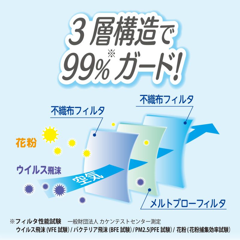 ●マスクの安全基準を評価する一般財団法人カケンテストセンターでの試験をクリア。日本の外部機関で認められた性能です。(花粉捕集率試験、VFE試験、BFE試験を実施)